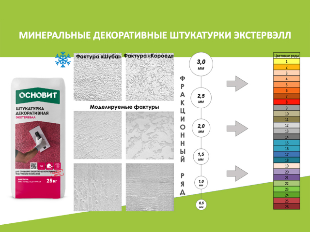 Штукатурка декоративная ОСНОВИТ ЭКСТЕРВЭЛЛ предназначена для создания декоративно-защитного слоя при отделке различных поверхностей, в т.ч. при устройстве системы фасадной теплоизоляции ОСНОВИТ. Рекомендуется под последующее окрашивание. Для ручного и механизированного нанесения. Для внутренних и наружных работ.
