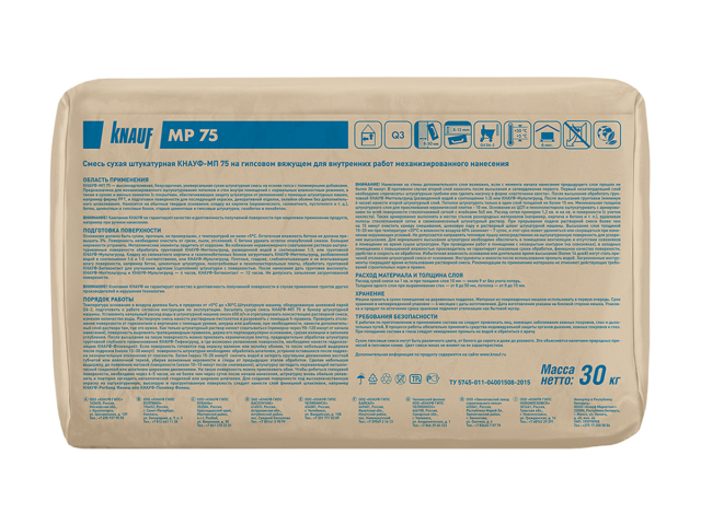 Сухая гипсовая смесь Knauf МП 75 для высококачественного оштукатуривания стен и потолков механизированным способом, 30 кг