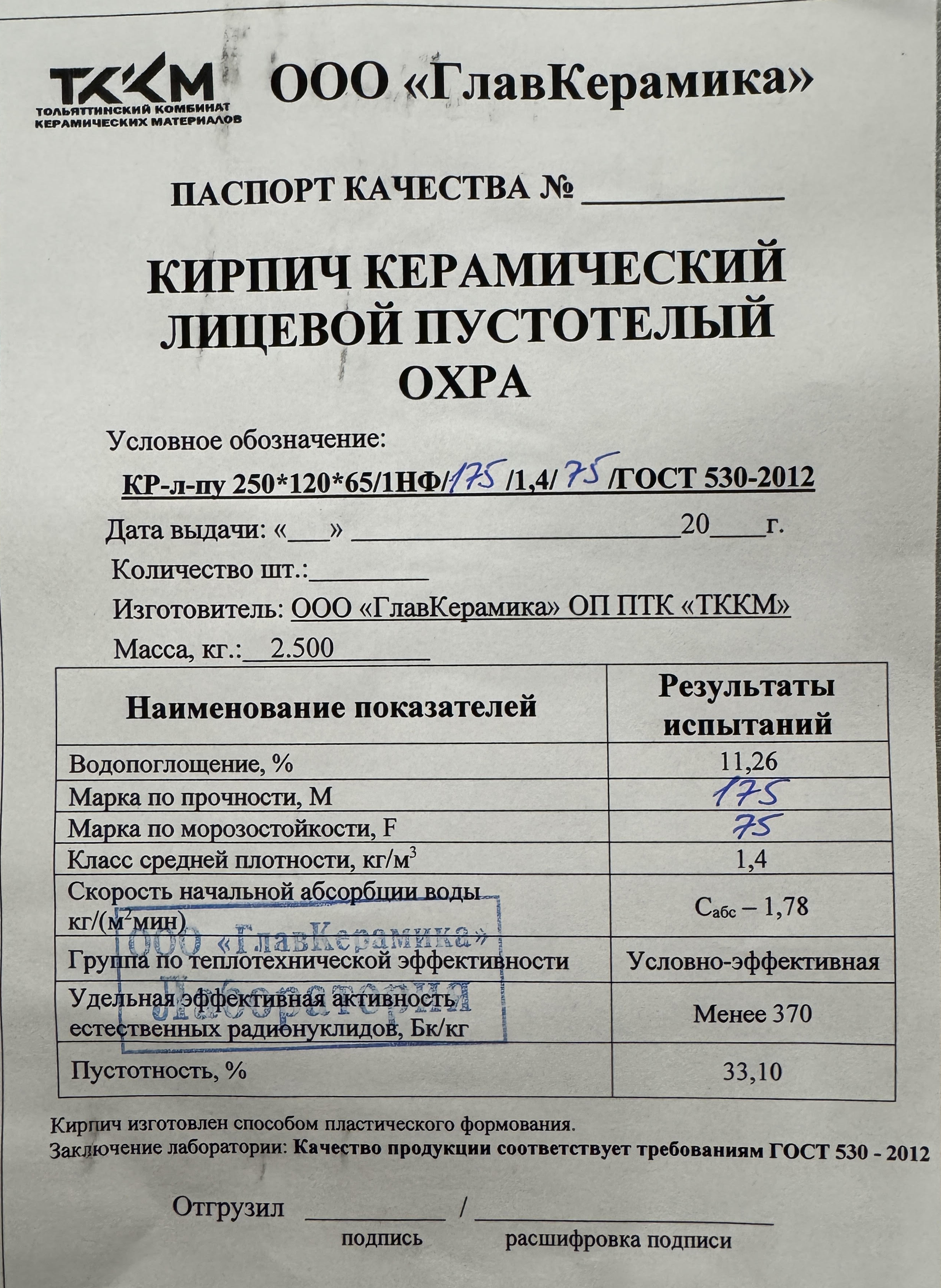 Паспорт качества на керамический лицевой кирпич Татищевъ Охра