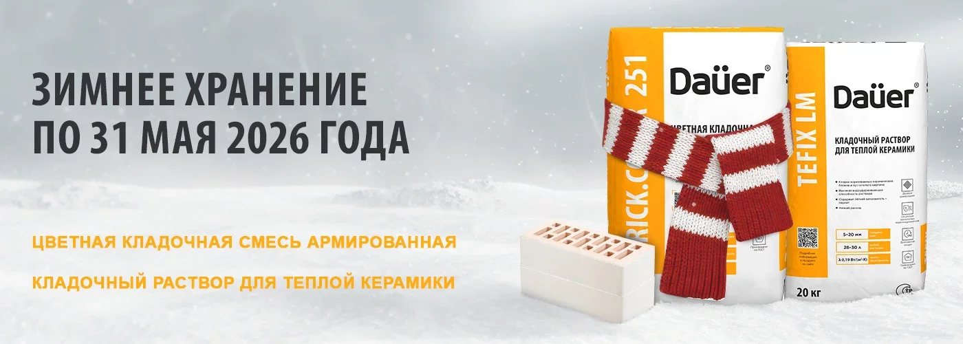 Уникальная акция для тех, кто планирует строительство заранее! При покупке тёплых растворов и цветных кладочных смесей DAUER прямо сейчас, мы предоставляем бесплатное хранение на нашем складе до 31 мая 2026 года.
